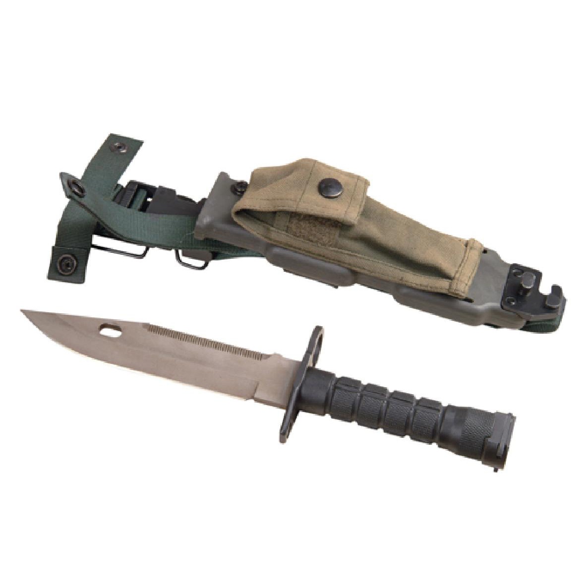 M9刺刀可作單兵匕首使用,具有砍、削、刺、劈、鋸等功能,可剪斷4毫米以下的鐵絲,刺穿1毫米厚的低碳鋼板;當作為刺刀使用時,可以與M16自動步槍相連接;附件袋中可容納手槍彈匣及其他小件物品,適合野外生存使用。